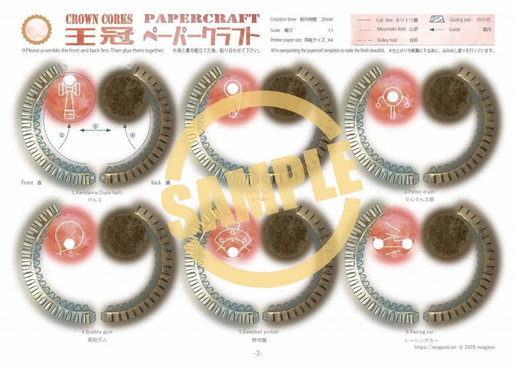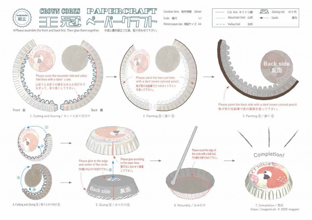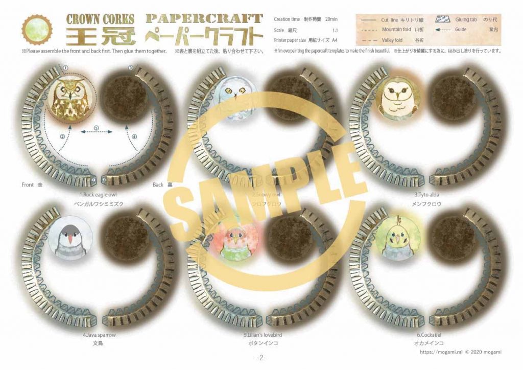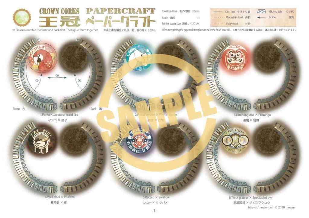 王冠 ビールの王冠をモチーフにしたペーパークラフトです。 パッケージイラストは、鳥や昔の玩具などをイメージしてデザインしています。 モデルデータ モデルサイズ: 幅 – 32mm, 高さ – 7mm モデルスケール: 1:1 制作時間: 20分前後 組立説明書: 有り 印刷用紙: 光沢紙① 参考リンク 組立て方 印刷方法
