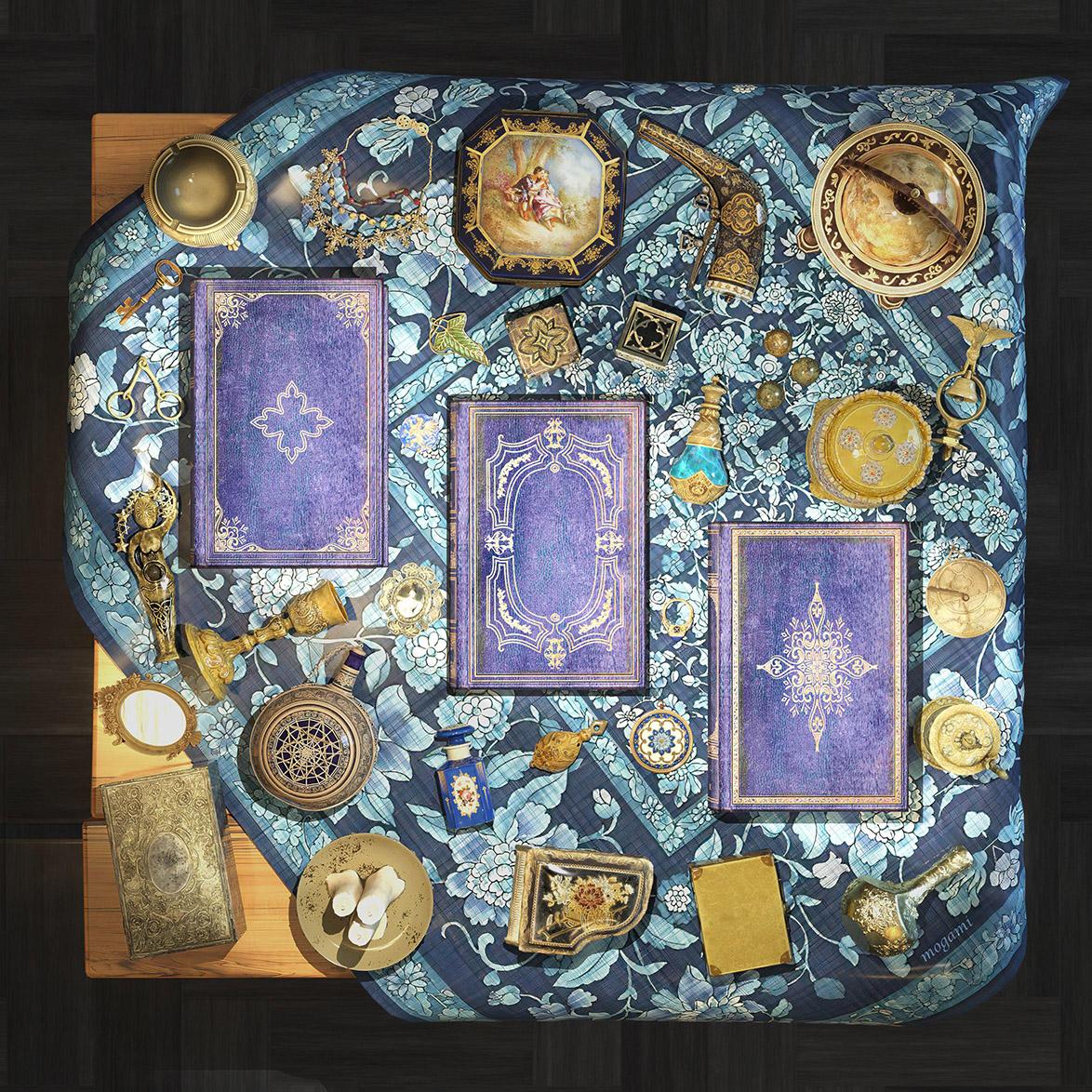 革の模様、金箔、紙の束、埃や砂の跡など本物のアンティーク本を彷彿させるような意匠に仕上げました。mogami shopの方で販売しています。